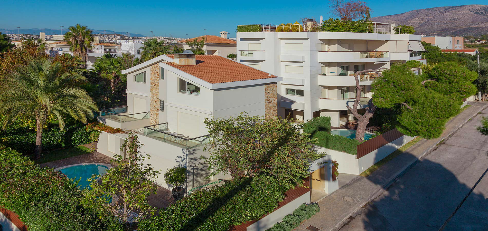 A refined contemporary style of architecture characterised by a combination of cream and earthy colours defines this development. It offers the ideal lifestyle for a family, close to the sea, in the peaceful suburb of Athens, Elliniko. A three story building with six spacious apartments – two on each level – a townhouse and a separate luxurious villa complete this project. The large verandas facing east encourage high quality outdoor living capitalising on sea view and open green space.