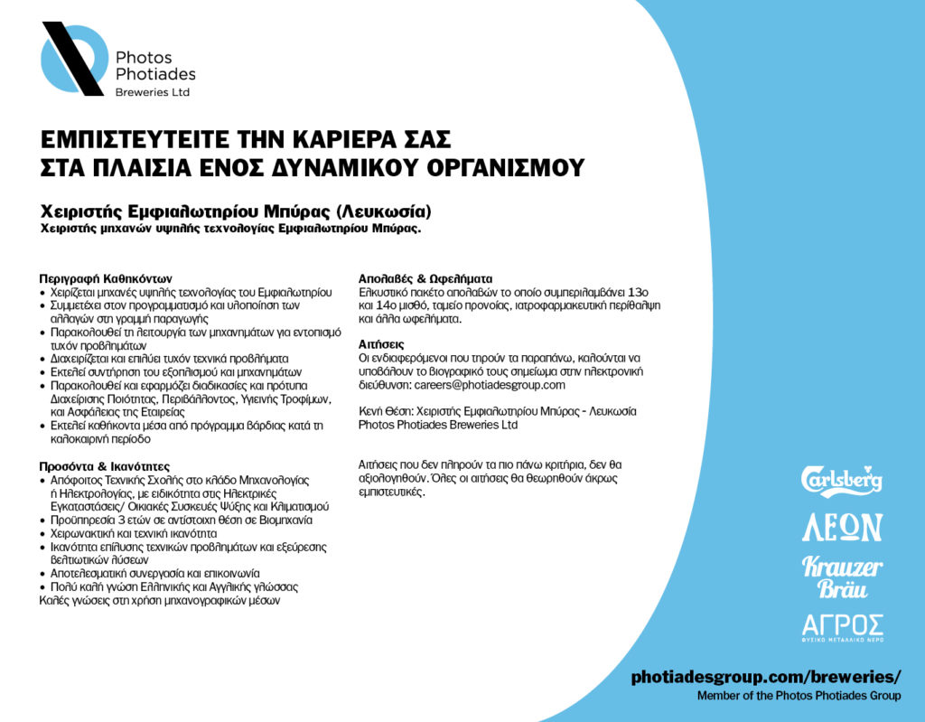 By Photos Photiades Group 11/04/2019 Comments Off on Χειριστης Εμφιαλωτηριου Μπυρας – Machine Operator